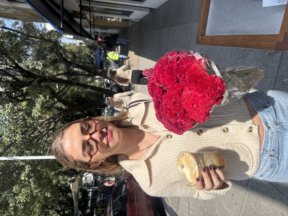 A young adult female is depicted standing on a paved sidewalk in Mexico City, Mexico, under bright sunlight. She is wearing small, oval, tortoise-shell glasses, a cream-colored knitted cardigan, and light blue jeans. Her eyes are closed, and she has a slight smile. Her right hand holds a clear plastic cup containing a layered brown beverage with foam, partially labeled "CÓDIGO CA". Her left hand holds a large, vibrant red bouquet of cockscomb flowers (Celosia cristata), wrapped in clear plastic. The background consists of a tree-lined street with parked vehicles and a row of commercial buildings, one featuring a blue awning. Several pedestrians are visible further down the street, including two women walking away and one individual wearing a high-visibility yellow jacket. The sky is clear.