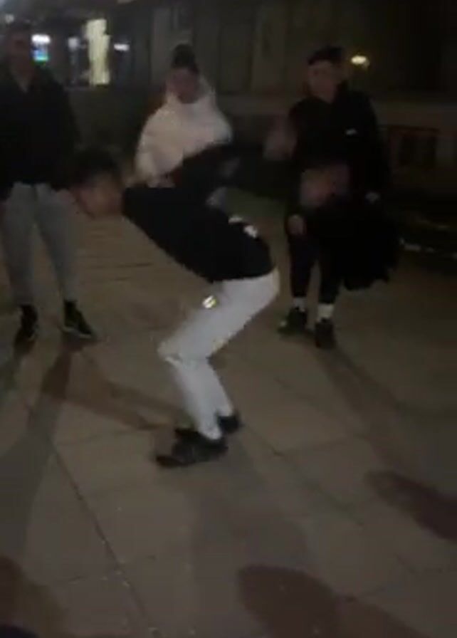 group of four young people standing outdoors on a paved area that appears to be a sidewalk or public space. One of them, dressed in white sweatpants and a dark sweatshirt, is performing a dance move that involves a kick. The others are watching him, and one of them is laughing. The setting looks like an urban area at night, illuminated by streetlights. There is a building in the background. The overall atmosphere is casual and playful.