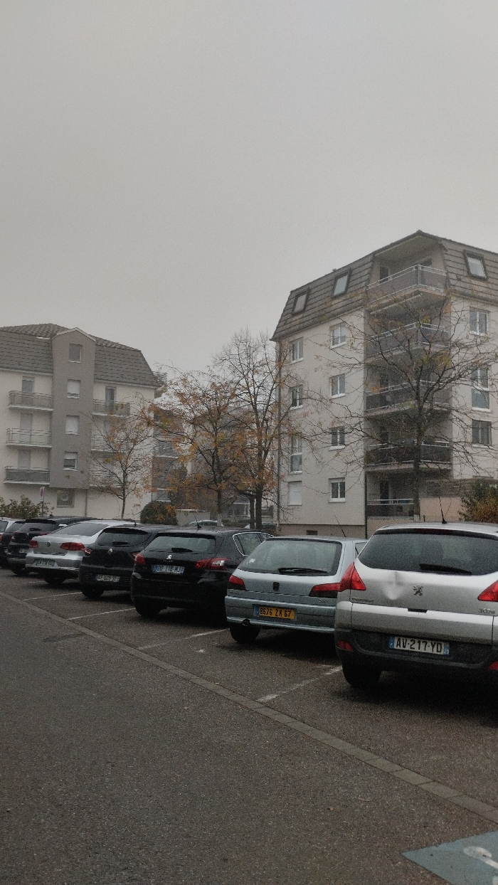 The image depicts an outdoor parking area in Bischheim, France, on an overcast day