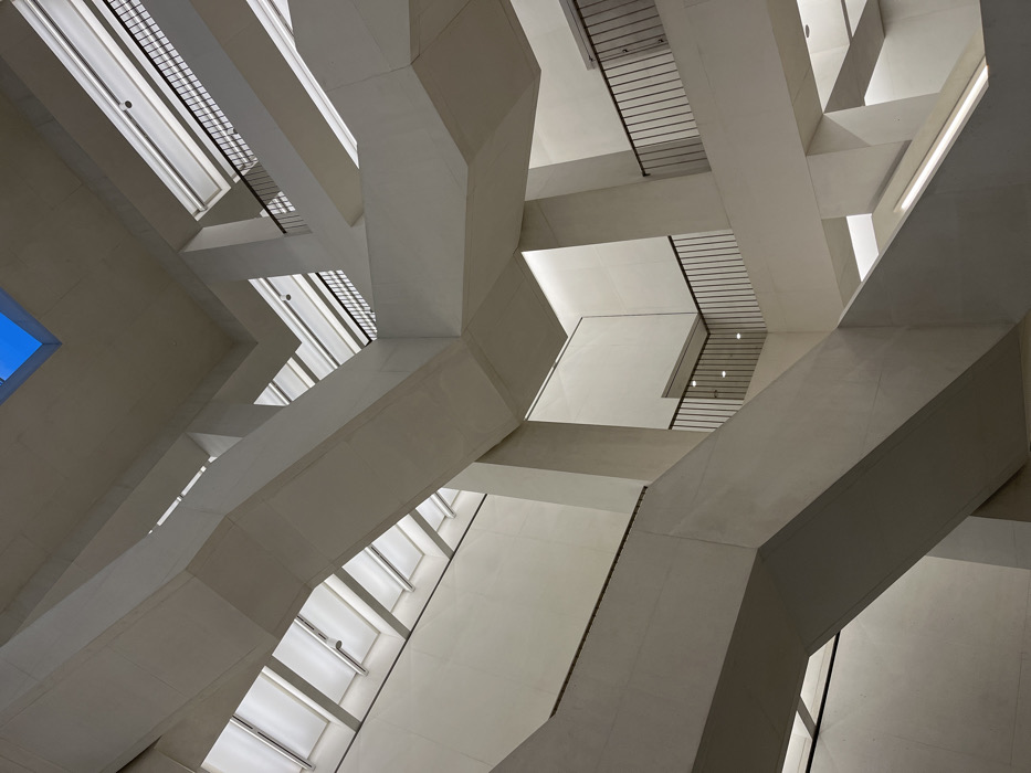 The image displays the multi-story interior of a modern architectural structure in Warsaw, Poland. The scene is dominated by a complex, interlocking network of angular walls, wide staircases, and supporting beams, all constructed from a uniform, smooth, light-toned material, likely concrete or stucco, presenting an off-white or light gray appearance. Several levels are visible, connected by these geometric staircases and landings. Some stair sections feature integrated linear light strips, casting illumination onto the pathways. Dark, vertically-barred metal railings border the upper walkways and landings, providing a stark contrast to the light surfaces. Natural light enters the space through multiple sources. A distinct rectangular skylight at the very top reveals a patch of clear blue sky. Additional light penetrates from slatted skylights or large, diffused windows positioned in the upper-left and upper-right sections of the structure. Artificial lighting supplements the natural light, with fixtures recessed or integrated into various architectural elements. The perspective is upward-looking, emphasizing the imposing height and intricate interplay of the structural components. No individuals or specific objects are present within the frame, maintaining a focus on the architectural form itself. The environment is clean and austere, highlighting the brutalist or deconstructivist design principles.