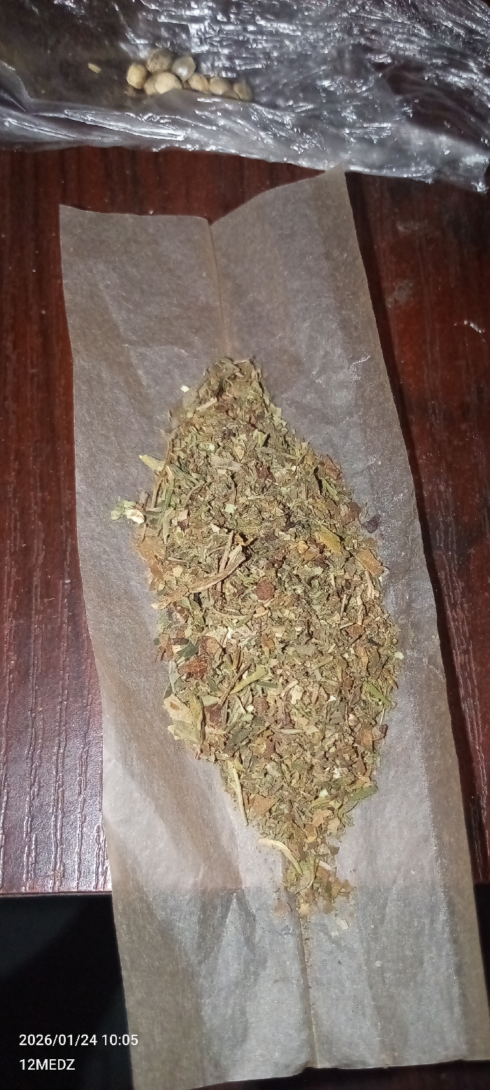 The image displays an overhead close-up view of a preparation for rolling, observed on a dark brown wooden surface within an indoor setting in Narayi, Nigeria. Centrally located on the surface is a rectangular piece of translucent, light-colored rolling paper, unfolded and creased lengthwise. A pile of dried, shredded plant material, primarily green with brown and yellowish-green fragments and visible stems, rests upon the rolling paper. In the upper left portion of the frame, a crumpled clear plastic bag contains approximately seven to eight small, ovate, light-tan seeds. The bottom left corner of the image includes a digital timestamp: "2026/01/24 10:05" and the text "12MEDZ". No individuals are visible.