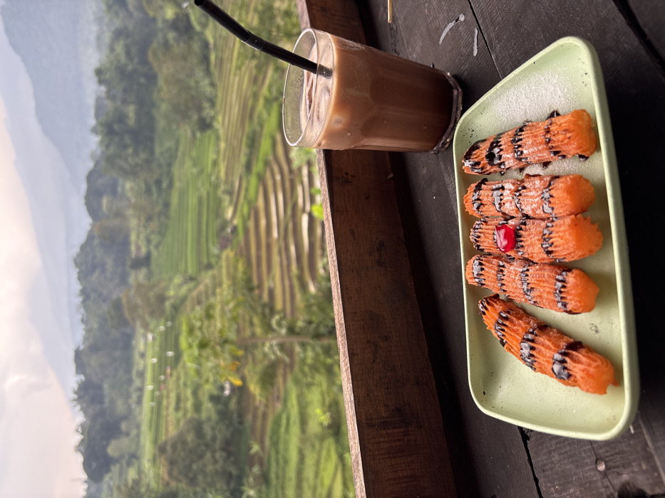 The image displays a forensic view of food and drink arranged on a dark wooden table against a scenic rural backdrop in Tamiajeng, Indonesia. In the foreground, a light green rectangular plate holds five orange, ridged pastries resembling churros, each drizzled with dark chocolate sauce. One pastry near the center is topped with a single red maraschino cherry. To the right of the plate, a clear glass contains an iced brown beverage, likely a chocolate drink or coffee, with a black straw inserted. The table surface exhibits minor white residue. A wooden railing forms a horizontal divider in the midground. The background reveals extensive, verdant terraced rice fields cascading down hillsides, interspersed with various trees and lush vegetation. Distant mountains are visible through a light haze under an overcast sky. No individuals are present in the scene.
