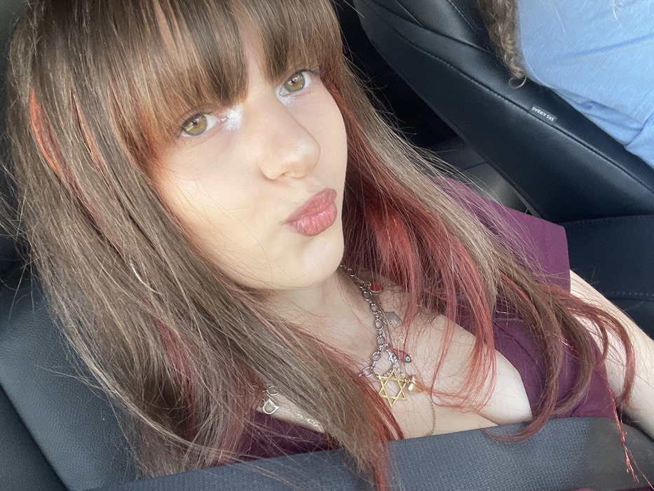 An image taken inside a vehicle in Kfar Saba, Israel, shows a female individual from the chest up, positioned in what appears to be the front passenger seat. She has brown hair with prominent reddish-pink and lighter highlights, styled with bangs, and hazel eyes with white highlight on the lower waterline. Her lips are slightly parted and appear to have a light pink gloss. She is wearing a dark reddish-purple v-neck top and a silver-toned necklace featuring multiple charms, including a prominent gold Star of David and a gold heart, along with a finer gold-toned necklace with a small heart. A car seatbelt crosses her left shoulder and chest. The interior of the car features dark, possibly black, leather seating. The text "SRS AIRBAG" is visible on the side of the seat. A person or object wearing a light blue top is partially visible in the bottom right corner of the frame, possibly in an adjacent seat or behind the main subject. The individual is looking directly at the camera.