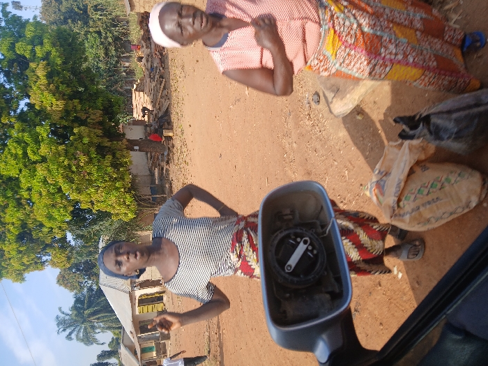 Two women stand outdoors on a dirt road. One wears a striped shirt and patterned skirt; the other wears a pink top and patterned skirt. Various items, including bags and an object resembling a car mirror, lie on the ground near them. A partially visible structure with a dark roof appears in the background to the left. In the distance, a pile of wood sits in front of greenery. The scene is captured from within a vehicle, evidenced by the rearview mirror housing on the right.