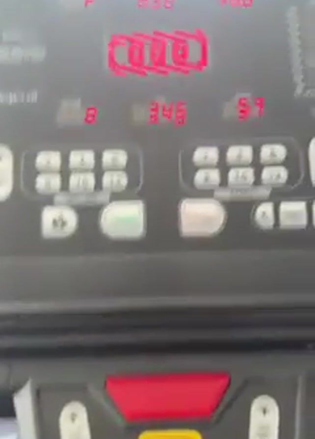 person walking on a treadmill. The camera angle is from behind the person, facing forward. We see the control panel of the treadmill, which shows information like speed and distance. Through a large window in front of the treadmill, we see a view of a street with cars and palm trees under a bright blue sky.