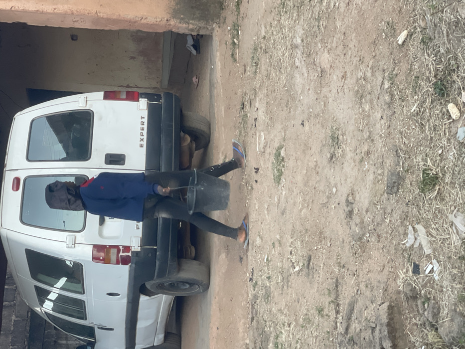 An individual is depicted walking from left to right on an unpaved, reddish-brown dirt path in Jos, Nigeria. The path is sparsely covered with dry grass and scattered debris, including white plastic remnants and what appear to be dried corn cobs. The person wears a dark blue long-sleeved top with a red and white stripe accent on the right shoulder, dark fitted trousers with small metallic accents on the outer seam of the left leg, and blue and brown flip-flops. Their head is covered with a dark fabric or headwrap. The individual carries an empty, dark-colored bucket by its handle in their right hand, held at hip level and swinging forward. In the background, a white Peugeot Expert panel van is parked, facing away from the viewer. The van's rear is visible, including its "EXPERT" branding and rear windows. The left rear taillight assembly appears damaged or partially missing. To the right of the van, a light brown building with a darker recessed entrance or doorway is visible, near which discarded footwear is present on the ground. The lighting suggests daytime.