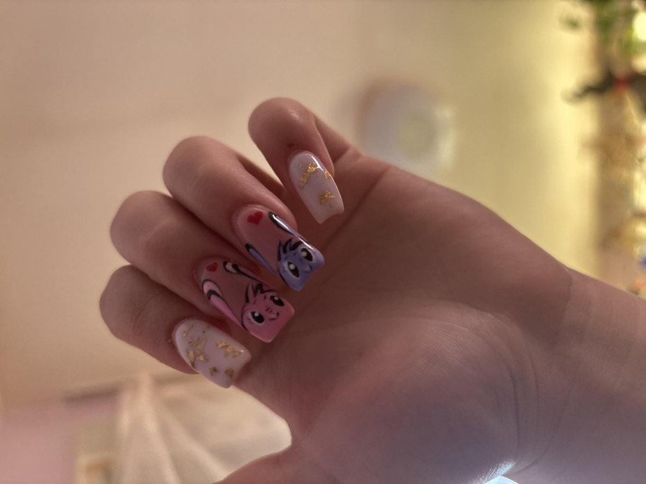 The image displays a human left hand held upright, with the palm facing the viewer, positioned indoors in Oreshak, Bulgaria. The subject's fingernails are artificial, elongated, and rectangular. The thumb, ring, and pinky fingernails are painted with a translucent or off-white base, embellished with irregular gold leaf flakes. The index fingernail features a cartoon character's face rendered in pink with black hair and upward-looking eyes, accompanied by a small red heart positioned near the cuticle. The middle fingernail showcases a distinct cartoon character's face in a grey-lavender hue, characterized by droopy eyes and a melancholic expression, also featuring a small red heart near the cuticle. The background is out of focus, presenting a warm, yellowish-beige expanse consistent with an interior setting under artificial lighting. A blurred, circular light source or fixture is indistinctly visible in the mid-right portion of the background.