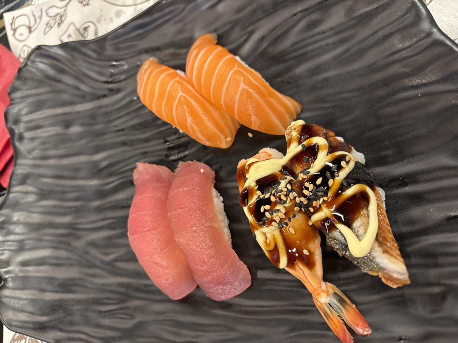A close-up, slightly elevated perspective depicts six pieces of nigiri sushi arranged on a black, undulating-surface platter, situated within a dining establishment in Plasencia, Spain. The upper left quadrant of the platter displays two tuna nigiri, characterized by their uniform pink-red coloration atop white rice mounds. To their right, in the upper right quadrant, two salmon nigiri are visible, distinguished by their bright orange hue and distinct white striations, also presented on white rice. The lower left quadrant features two specialty nigiri: one comprises a cooked shrimp, adorned with a dark, viscous sauce, a lighter, opaque sauce, and an application of black and white sesame seeds over the shrimp and rice; the adjacent piece, an eel nigiri, is similarly prepared with dark and light sauces, and sesame seeds. A partial view of a white patterned surface is visible in the top right background, indicating a table covering.