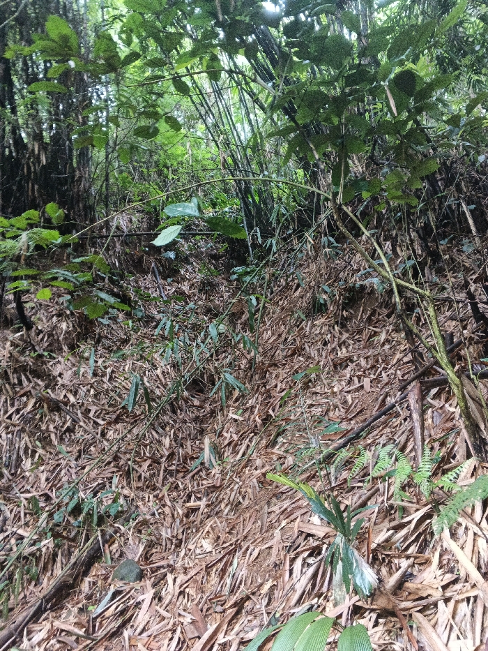 The image displays a densely vegetated outdoor scene located in the city of Baglung, Nepal. The ground is significantly covered with a thick, uneven layer of dry, light brown, decomposing bamboo leaves and other organic matter, forming a natural litter layer. This terrain appears to slope gently upward from the foreground toward the background. Numerous slender, vertical green bamboo culms are prominent in the mid-ground and background, indicating a bamboo grove or forest. Various types of green foliage are interspersed throughout the scene, including broad-leafed plants, smaller fern-like growths visible in the lower right, and a distinct plant with elongated, light green leaves positioned in the lower center-right. No individuals, human activity, or man-made objects are present. The ambient lighting is diffused, suggesting an overcast sky or shaded conditions.