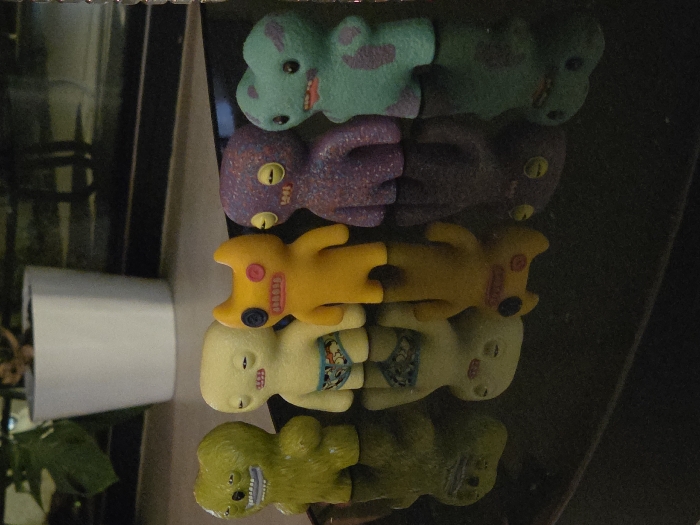 - "Five small, anthropomorphic-like collectible figures stand in a linear arrangement on a dark, highly reflective surface" by FM-kNXPq2, licensed under CC BY 4.0