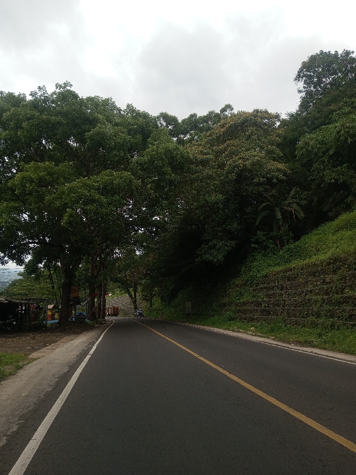 A paved road cuts through a lush, green landscape under an overcast sky. Thick foliage lines the road, with trees arching over it on one side and a tiered retaining wall covered in vegetation on the other. A yellow center line guides the way, while hints of buildings peek through the trees on the left. A motorcycle is parked further down the road.