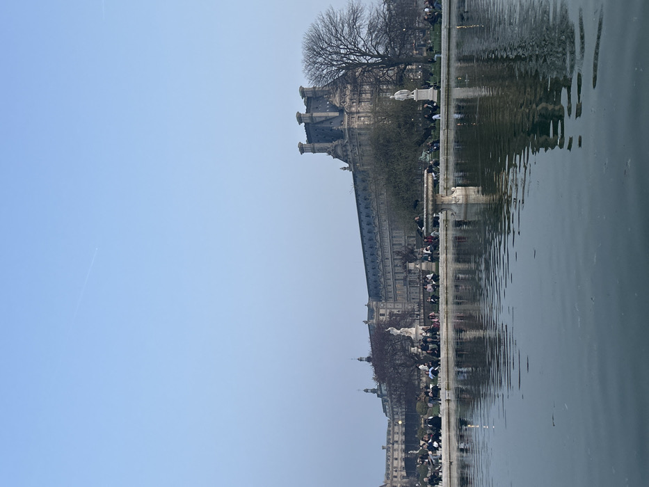 The image depicts a panoramic view within the Tuileries Garden in Paris, France, facing eastward towards the Louvre Palace. In the foreground, a large, rectangular pond with a calm, dark surface reflects the sky and distant elements. Along the far edge of the pond, two white stone classical fountains are visible, with several white classical statues positioned among bare deciduous trees and sparse green shrubbery. Numerous individuals, estimated between 50 and 70, are seated on chairs or benches along the pond's perimeter, engaging in leisure activities. The background is dominated by the extensive, multi-story facade of the Louvre Palace, characterized by its classical French architectural style, numerous windows, and distinctive mansard roofs. The sky above is a clear, light blue with a single faint aircraft contrail visible in the upper right quadrant. The lighting is soft and diffused, indicating late afternoon or early evening.