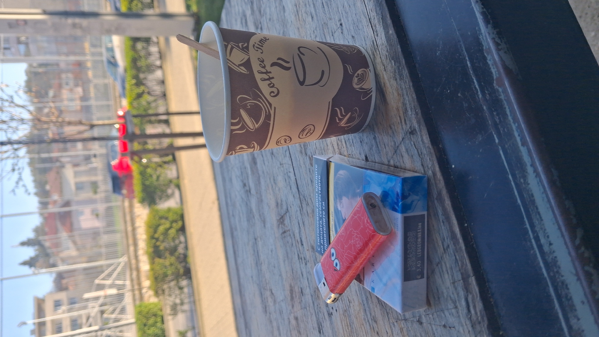 The image depicts a coffee cup, a pack of cigarettes, and a lighter placed on a wooden table. The coffee cup has a "Coffee Time" label on its exterior. The cigarette pack is blue and white, partially obscured by a red lighter. The cigarette pack contains text in Bulgarian. The background reveals an urban environment with buildings, trees, and possibly cars, suggesting an outdoor cafe setting. This photograph appears to have been taken in Goce Delchev, Bulgaria.