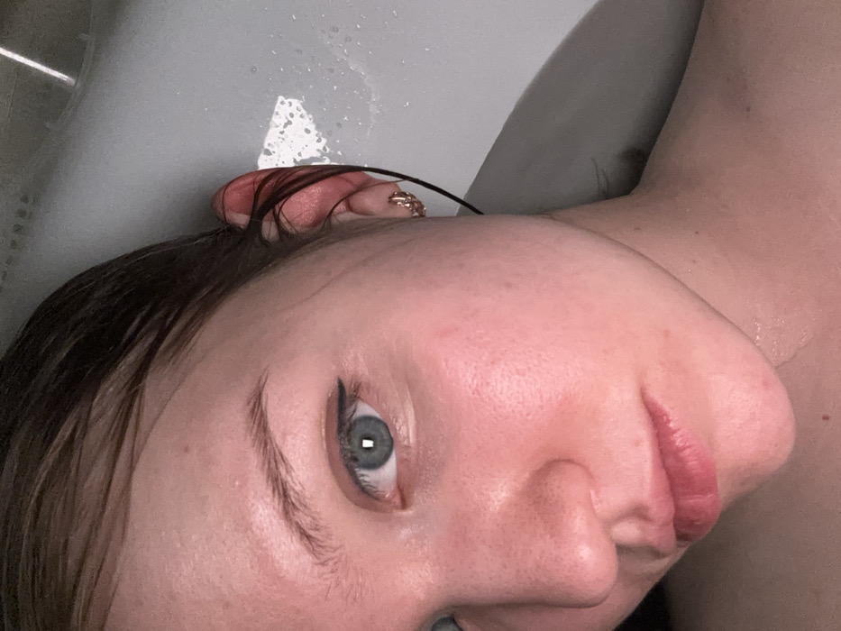 A close-up portrait of a woman's face with a blue eye. Her wet, dark hair is slicked back. She's wearing winged eyeliner. Her skin is damp and has visible pores. A ring is visible on a finger near her ear. She appears to be lying down, possibly in water, as suggested by the wetness and the edge of a bathtub-like surface visible in the background. The image is rotated, giving a disoriented perspective.