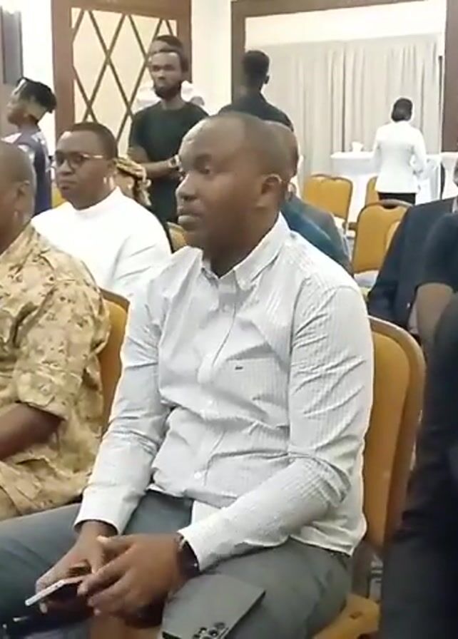 room full of people seated in rows of yellow chairs. The people appear to be at a formal event or meeting. Some are dressed in suits and ties, while others are in military uniform or casual attire. Some people are holding or looking at their phones. There are photographers and videographers at the back of the room. The room is well-lit, with a white wall in the background. The overall atmosphere appears serious and attentive. The speaker is apparently discussing the promoter of the radio.
