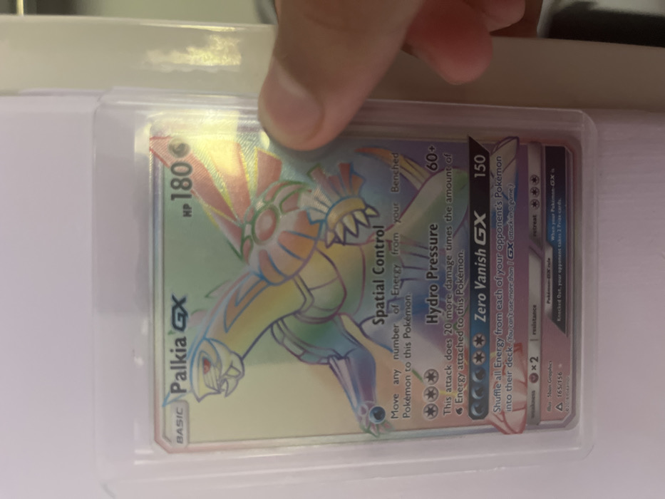 - "The image presents a close-up, slightly angled view of a Palkia GX Rainbow Rare Pokémon trading card, identified as 165/156 from the Sun & Moon Ultra Prism set" by FM-YFYOS2, licensed under CC BY 4.0