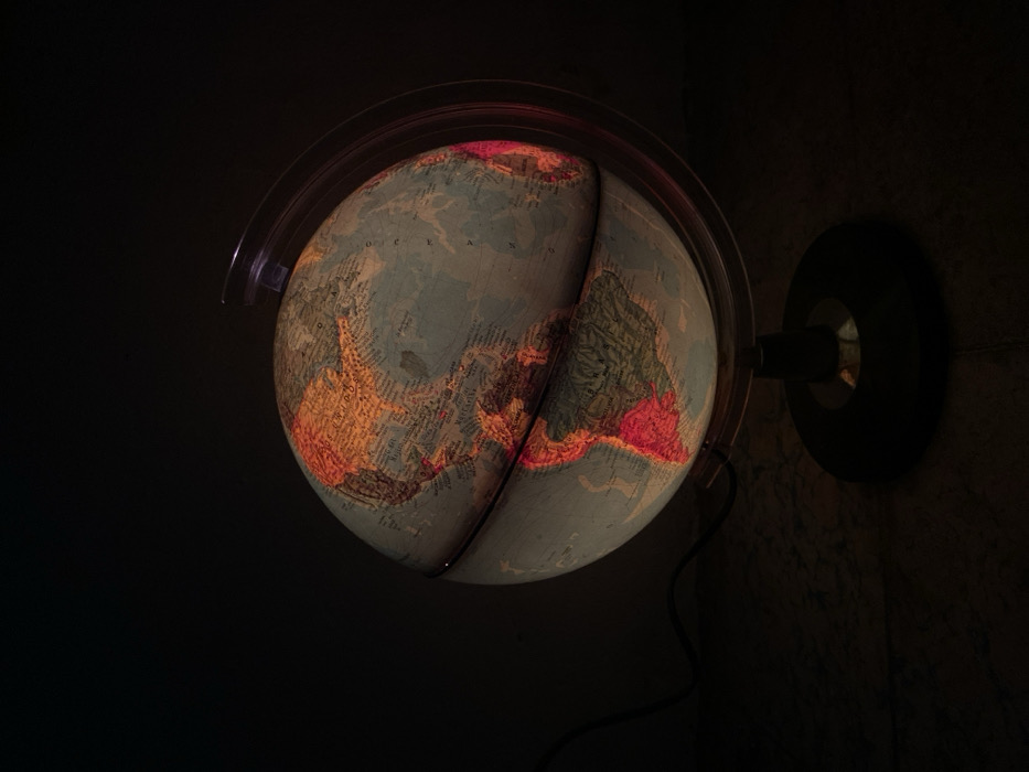 A dimly lit globe is the focal point, with illuminated continents casting a warm glow