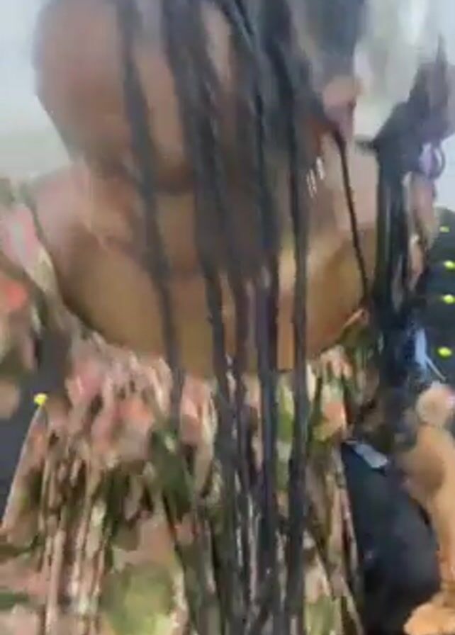 Two young women are in an interior space, possibly a hair salon. One is in the foreground, wearing a floral off-shoulder dress, with her hair braided. She briefly gestures with her hands. The camera moves to show another young woman sitting on a black bench covered with yellow decorations. She is wearing a denim jacket, leggings, and has dark hair styled with spiral curls at the ends. She looks away, then touches her face. Upbeat music is playing.