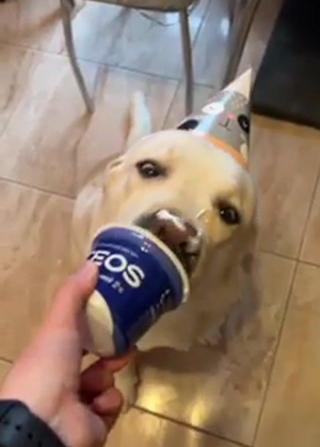 A short video shows a tan-colored labrador retriever wearing a party hat and eating out of a blue and white Teos yogurt cup