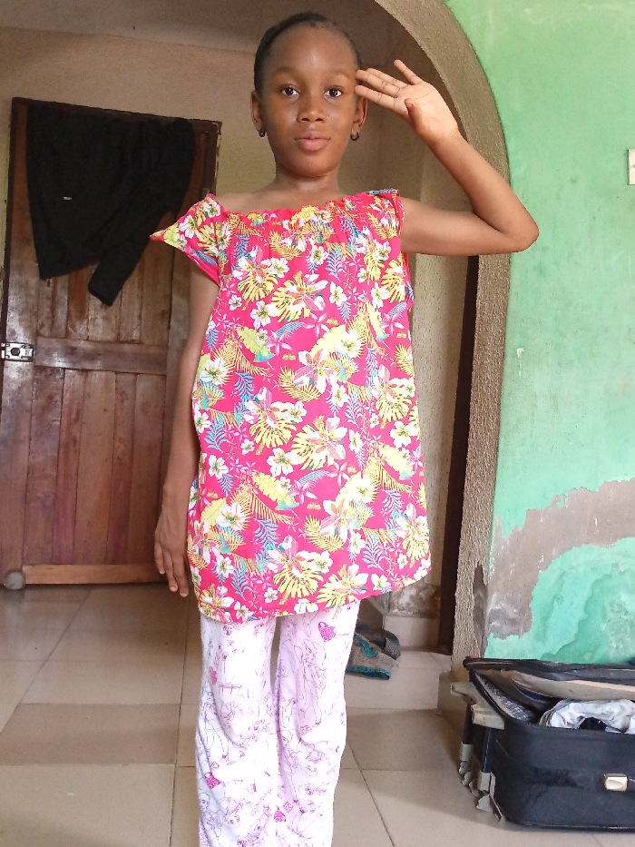 A young girl with dark skin and dark hair stands front-facing, performing a salute with her right hand raised to her forehead. She wears a pink off-shoulder top with a vibrant yellow, white, and blue floral pattern and light-colored trousers with a faint design. Her left arm hangs relaxed at her side. She has small hoop earrings in both ears. The floor beneath her is tiled with light-colored squares. To her left, a wooden door with a silver-colored handle is partially visible, with a dark fabric item draped over it. To her right, a wall painted green and blue shows significant paint peeling and discoloration, revealing a lighter underlayer, and an arched doorway is present further right. In the lower right corner, an open black hard-shell suitcase or box containing light-colored items rests on the floor. The scene is set indoors, likely within a residence, in the city of Unknown, Unknown.