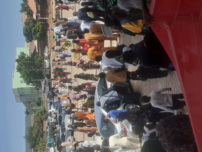 The image depicts a busy outdoor scene in Jos, Nigeria, during daylight hours under a clear blue sky. A large congregation of approximately 100-150 individuals, primarily adults with some children, occupies a paved area constructed from interlocking blocks. People are dressed in diverse civilian attire, including traditional Nigerian clothing and Western casual wear, exhibiting a wide range of colors and patterns. Most individuals are standing, walking, or conversing in small groups, with no apparent unified action. Numerous vehicles, including sedans, SUVs, and vans, are parked on the paved surface, predominantly in the mid-ground. A silver sedan in the central mid-ground is surrounded by several individuals, with one male in a blue shirt seen leaning into the vehicle. In the background, a prominent light green multi-story building with multiple windows stands out, flanked by other residential-style structures featuring reddish-brown roofs and scattered mature trees. A small, decorative plant is visible in a circular planter within the paved area. The immediate foreground on the lower right is partially obscured by a red metal structure, likely a railing or part of a playground slide. The scene conveys an impression of a bustling public space or a significant social gathering.