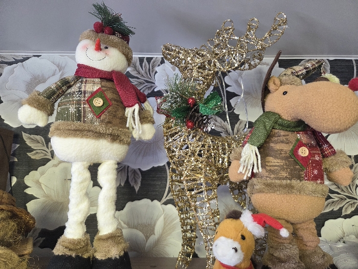The scene, situated in Ольховка, Russia, displays a collection of festive figurines on a light-colored surface against a dark background featuring large white and grey floral patterns. From left to right, a standing snowman plush wears a plaid brown and green tunic, a red scarf, and a hat adorned with pine sprigs and red berries, with an orange carrot nose. Adjacent to it stands a golden, wire-frame reindeer figurine, decorated with green foliage and red berries. To the right, a plush tan moose-like figure wears a green scarf and a brown and red patterned shirt. In the foreground, below the moose, is a small tan and white plush horse wearing a miniature red Santa hat.