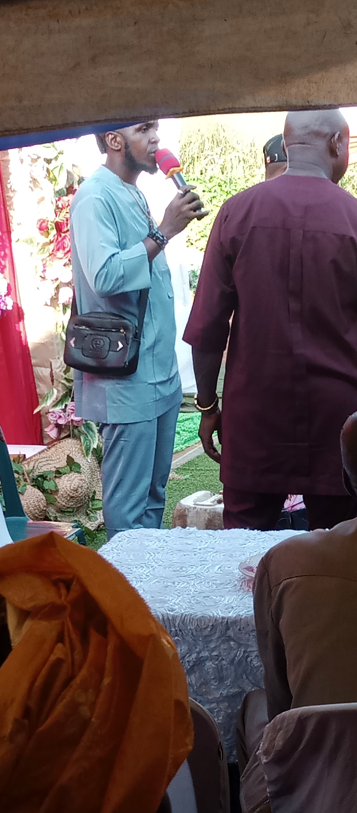 The image depicts an outdoor gathering in Udi, Nigeria. A male individual, positioned left of center, wears a light blue tunic and matching trousers, along with multiple dark beaded bracelets on his left wrist and a dark shoulder bag with a front decorative element. He holds a red and silver microphone to his mouth, facing right in profile. To his immediate right, a bald male wears a dark maroon tunic and a gold-colored bangle on his right wrist, with his back partially to the viewer. In the lower right foreground, a third individual is partially visible, seated, with an orange fabric draped over their person. The foreground includes a table covered with a white, textured tablecloth. The background features event decorations: red fabric drapes on the far left, artificial foliage with pink flowers, and woven straw-like objects, one large and round with green leaves. A green mat-like surface is on the ground, with an unidentifiable light-colored decorative object further back. Natural green foliage is visible in the distant background, and a wooden beam stretches across the top of the frame.