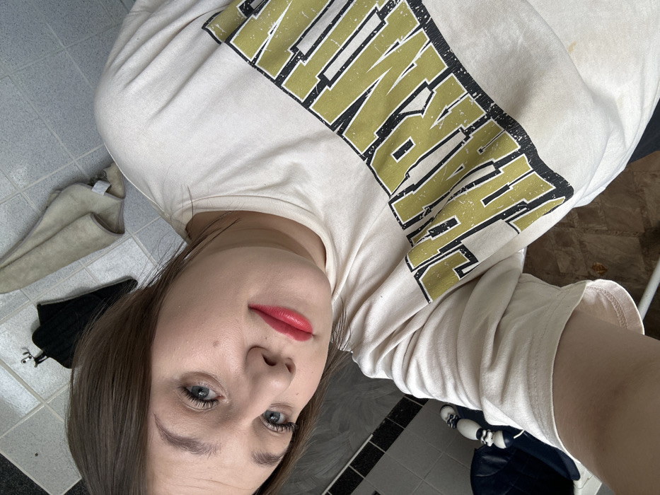 An individual is depicted in a close-up selfie taken within an indoor environment, consistent with a bathroom. The exact city of Chaikovsky, Russia, cannot be determined from the visual evidence. The subject is a light-skinned female with medium brown hair, wearing a light beige short-sleeved t-shirt featuring distressed block letters in olive green and black, partially spelling "CHARMTI" or similar text across the chest. She has blue eyes, visible eyelashes, and her lips are colored with a vibrant red or coral lipstick. She looks directly into the camera with a slight upward tilt of her head. The background consists of tiled walls; the upper section features light grey or off-white square tiles, while the lower section has darker grey or black square tiles with a horizontal black trim line. Hanging on the upper tiled wall are a small black knitted item and a light beige or off-white towel. A portion of a white ceramic fixture, likely a toilet or sink, is visible in the lower left quadrant of the image. The floor appears to be tiled with light brown or tan squares.