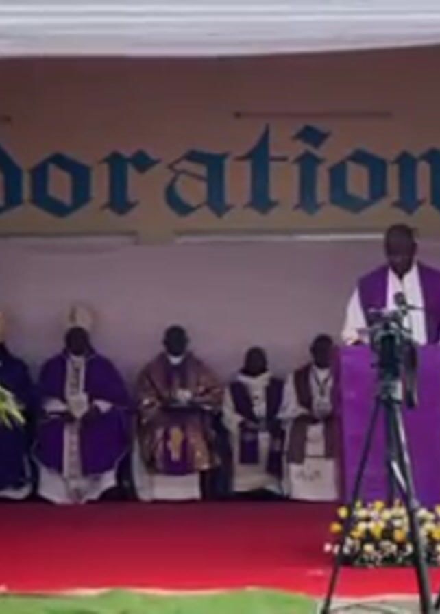 A man in purple robes stands at a podium and addresses the camera. He appears to be giving a speech or sermon. Behind him are several men in religious garb seated in a row. A cameraman with a blue vest bearing the logo “rtnc PRESSE” films the speaker. The event takes place under a white tent with a red carpet. A large sign behind the speaker reads “d’adoration”. There is a potted plant on the left and a floral arrangement at the base of the podium.