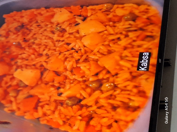 A close-up shot features a vibrant dish of Kabsa, an Arabic mixed rice dish. The rice is tinted a bright orange, interspersed with chunks of similarly colored carrots and lighter-toned potatoes. Green peas are scattered throughout the dish. The side of a device, possibly a television or large tablet, is visible to the right, displaying the text "Kabsa" in a vertical orientation and the phone model "Galaxy A54 5G" in the corner.