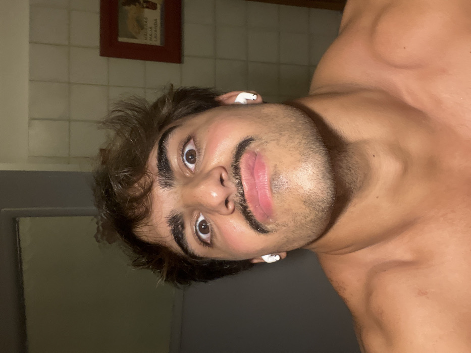 A shirtless man with brown hair and eyes, wearing white earbuds, looks intently at the camera