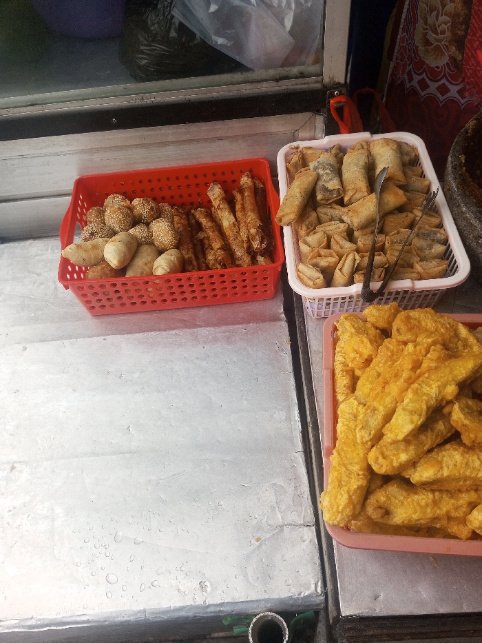 Three baskets hold an assortment of fried foods. A red basket contains fried balls and rolled snacks. A white basket is filled with small, folded fried treats, accompanied by a pair of tongs. A pink basket overflows with long, yellow fried items. The baskets rest on a metallic surface beside a mortar.