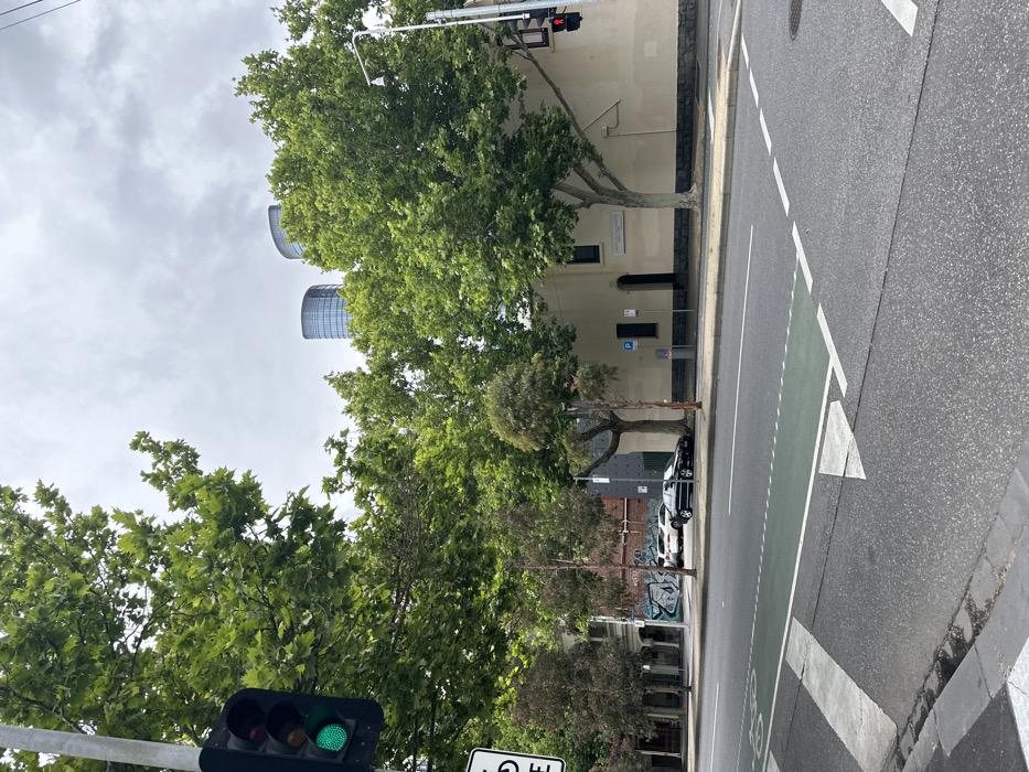 A street view shows a tall, nondescript building alongside a road with a dedicated bike lane. Several trees line the road, partially obscuring the building. Two cylindrical towers peek above the trees in the distance. Cars are parked along the side of the road near a brick wall with graffiti. A traffic light displays a green light. The sky is overcast.