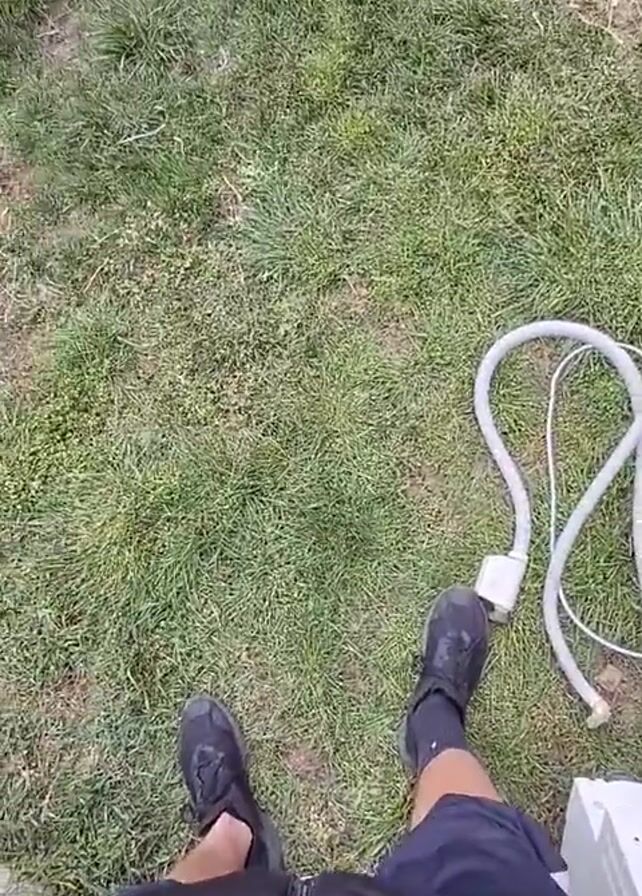 person standing in a grassy yard next to a disassembled appliance and various wires
