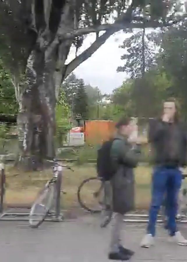 scene near a construction site. There are several bicycles parked in a row. People are seen walking around the area. A small excavator and construction materials are visible behind a fence. Signs are present indicating walking paths. The area has trees and buildings in the background.