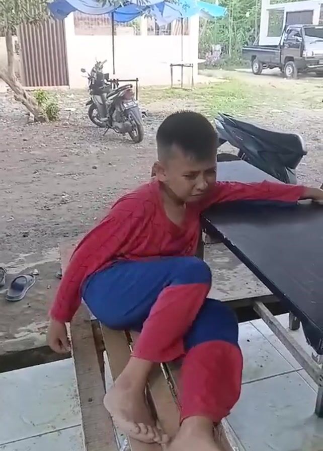 A young boy dressed in Spider-Man themed pajamas sits on a crude wooden bench in an outdoor setting. He is crying and appears distressed. He is barefoot. The bench is made of rough wooden slats. A black table is next to him. In the background, there is a motorcycle, a pickup truck, and other outdoor furniture. The area appears to be a yard or outdoor common space. A building with a corrugated metal roof is visible. There are trees providing some shade.