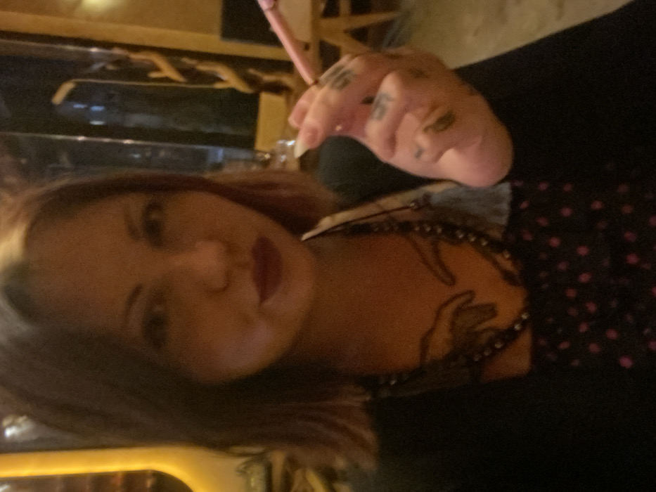 A woman with auburn hair and dark lipstick poses close to the camera. She wears a black shirt with pink polka dots and a beaded necklace. A tattoo is visible on her chest. Her hand, adorned with tattoos, holds a pink vape pen. The background is dimly lit, possibly a bar or restaurant setting.
