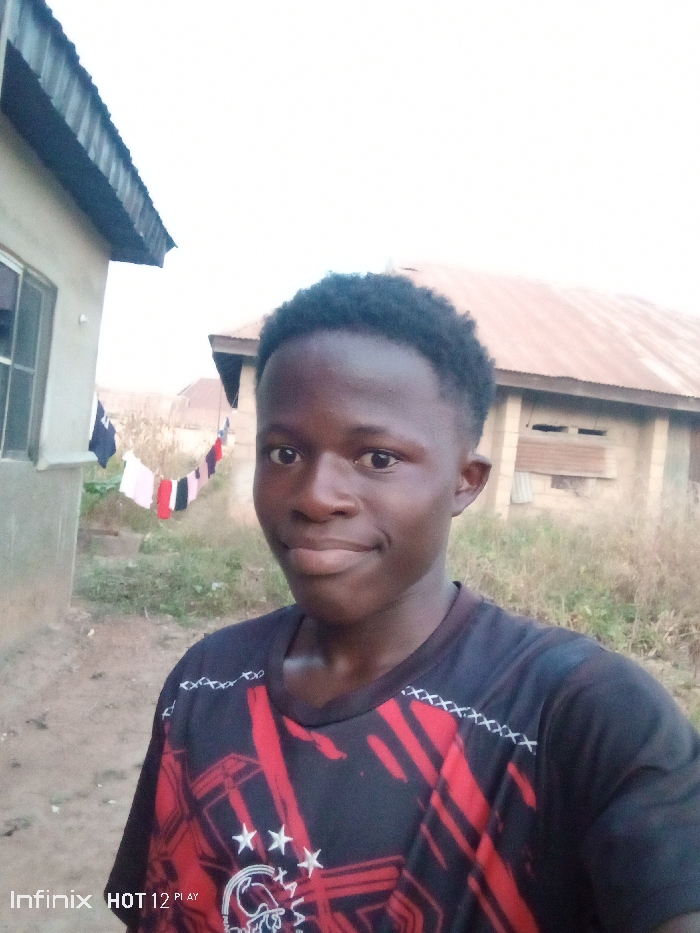 A young Black man smiles at the camera. He wears a black and red patterned T-shirt. Behind him are buildings with a metal roof. Clothes are hanging on a line between the buildings. The sky is overcast. The "Infinix HOT 12 PLAY" watermark is visible in the bottom left corner.