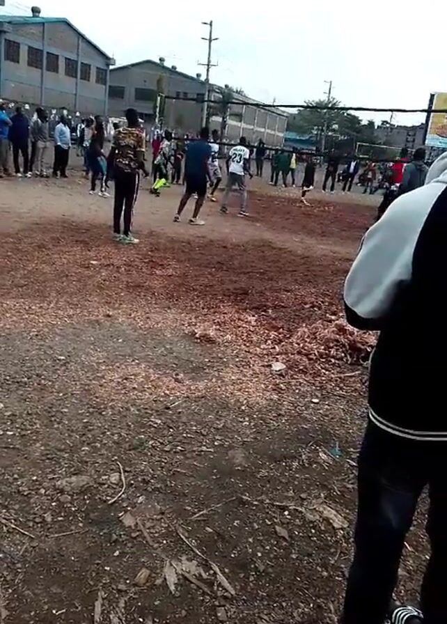 group of people playing a volleyball game on a dirt field. A net is set up in the middle of the field, and the players are spread out on either side of the net. The ground is covered with dirt and some wood chips. A crowd of spectators stands around the perimeter of the field watching the game. In the background, there are several buildings and power lines. The weather appears to be overcast. The camera is held by someone who is standing close to the playing area, facing the volleyball game.