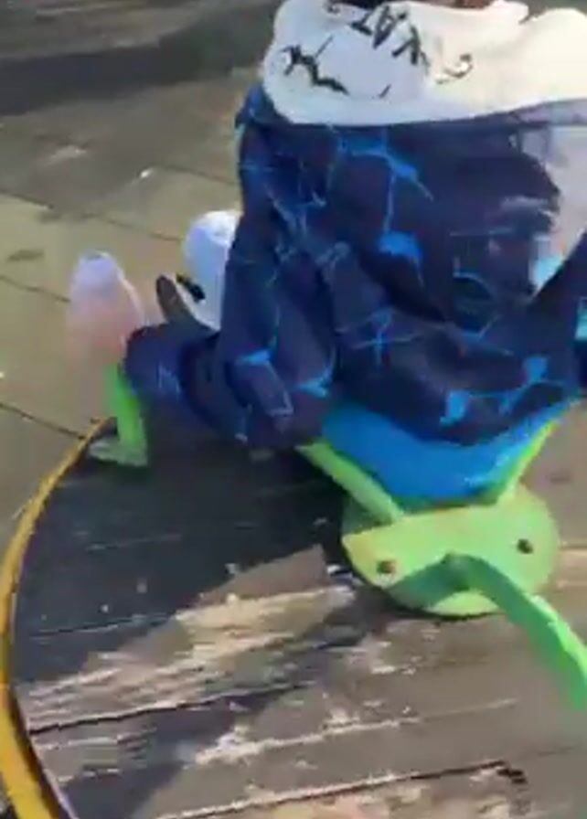 A young person is playing on a playground merry-go-round