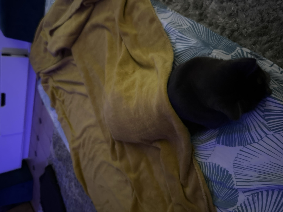 A gray cat rests on a bed with a blue and white patterned sheet and a mustard yellow blanket. The cat is curled into a loaf shape, its dark fur blending into the shadows. The blanket is draped casually over the edge of the bed. A white dresser with a black handle is visible in the background, lit with blue light. A section of gray carpet lies adjacent to the bed.