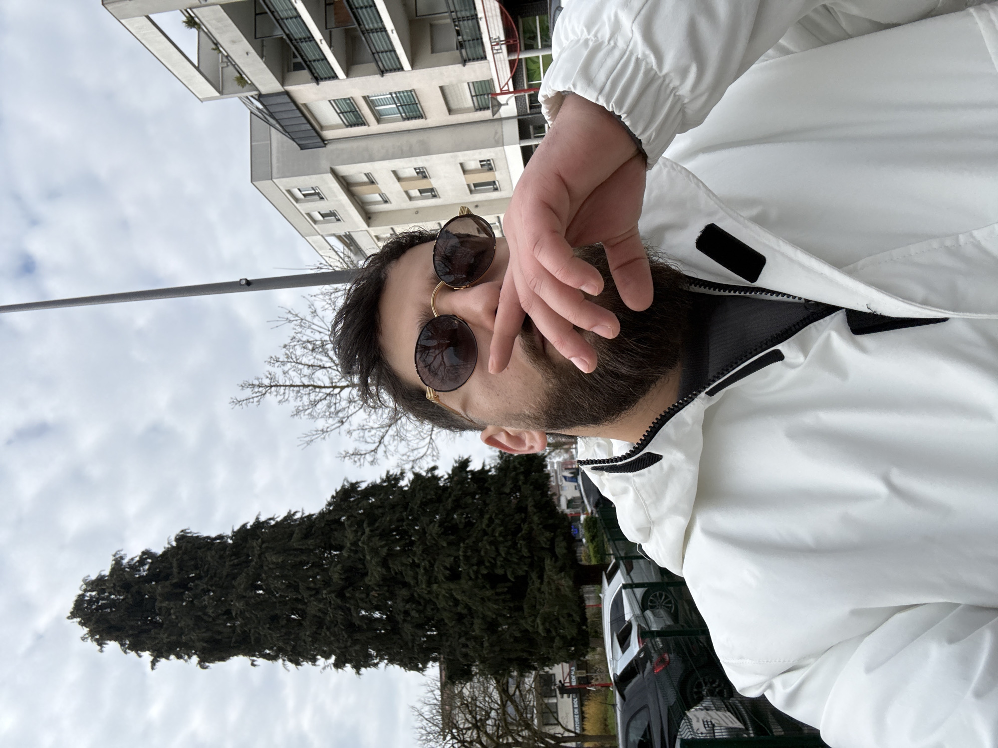 A forensic examination of the image reveals an adult male in an urban environment, identified as the city of Lingolsheim, France, captured in a slightly low-angle perspective. The subject occupies the right half of the frame, facing partially away from the camera, with his right hand covering a portion of his mouth and nose. He has dark hair, a full beard, and wears round, gold-framed sunglasses with dark lenses. His attire consists of a white hooded jacket with black zipper and black accents near the collar, over a dark grey garment. The background features a diverse urban landscape under an overcast sky with scattered white clouds. To the left, a tall, dark green coniferous tree stands prominently, with bare deciduous tree branches visible beside it. Behind the tree, a multi-story building displays a partially visible sign indicating "LABORATOIRE DE BIOLOGIE MEDICALE." Several modern, light-colored apartment buildings with balconies and varied window configurations are visible in the mid-ground and background, particularly on the right side of the frame. A tall, dark grey street light pole extends vertically from the lower center towards the top. A row of parked cars, including black and white vehicles, is visible behind a green metal fence in the lower-left quadrant. The overall scene suggests a public street or sidewalk area.