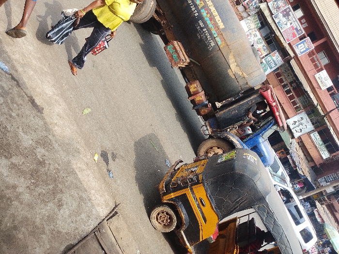 The image depicts a dynamic street scene in Nkpor, Nigeria, captured from an elevated perspective, rotated approximately 45 degrees clockwise. A gray paved road, exhibiting dirt, stains, and scattered leaves, diagonally traverses the frame from the bottom-left to the top-right. Two pedestrians are visible on the road. In the upper-left, the lower legs and feet of an individual, wearing light-colored trousers and brown slippers, are partially visible, moving towards the top-left edge. Centrally located, another individual, wearing a yellow shirt, dark pants, and brown flat shoes, walks diagonally towards the bottom-right. This person carries a black-and-white striped bag in their left hand and a reddish-brown handbag in their right. Vehicles occupy the right-central portion of the road. A large, dark blue or black tanker truck features a prominent cylindrical tank, marked with white text including "08037878" and "08022556217." Inside the truck's blue cab, a male individual in a dark t-shirt is visible, leaning forward. Directly in front of the tanker, a yellow and black three-wheeled Keke Napep (tricycle taxi) is positioned, facing away from the viewer. A partial view of a white vehicle is seen behind the Keke Napep. Adjacent to the road, on the right side of the frame, a multi-story building with a reddish-brown facade is extensively covered with various commercial advertisements and brightly colored posters, one explicitly displaying "MTN." The scene is under daylight conditions, indicated by discernible shadows cast on the pavement.