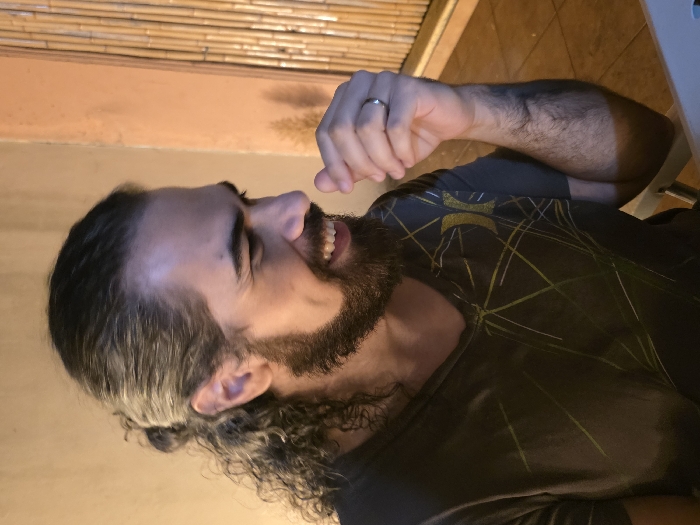 An adult male is depicted in a close-up, waist-up portrait taken in Villa San Andrés, Argentina. He is positioned facing right in profile, smiling with teeth visible and a dimple on his left cheek. He possesses long, dark, wavy hair pulled back into a small bun or ponytail, with loose curls framing his neck and ears, and a full, dark beard and mustache. He is wearing a dark grey V-neck t-shirt with a pattern of thin, light-colored geometric lines and a partial light-colored logo on the right chest, appearing to be a curved 'Hurley' emblem. His left hand is raised towards his mouth, with fingers slightly curled, and a plain silver-colored ring is visible on his left ring finger. His left forearm, covered in dark hair, rests on an unseen surface. The background features a plain, light tan wall to the left and a vertical screen or decorative element composed of light-colored bamboo rods to the right. A white surface is partially visible in the bottom right corner, likely a table. The scene is illuminated by warm, artificial light.