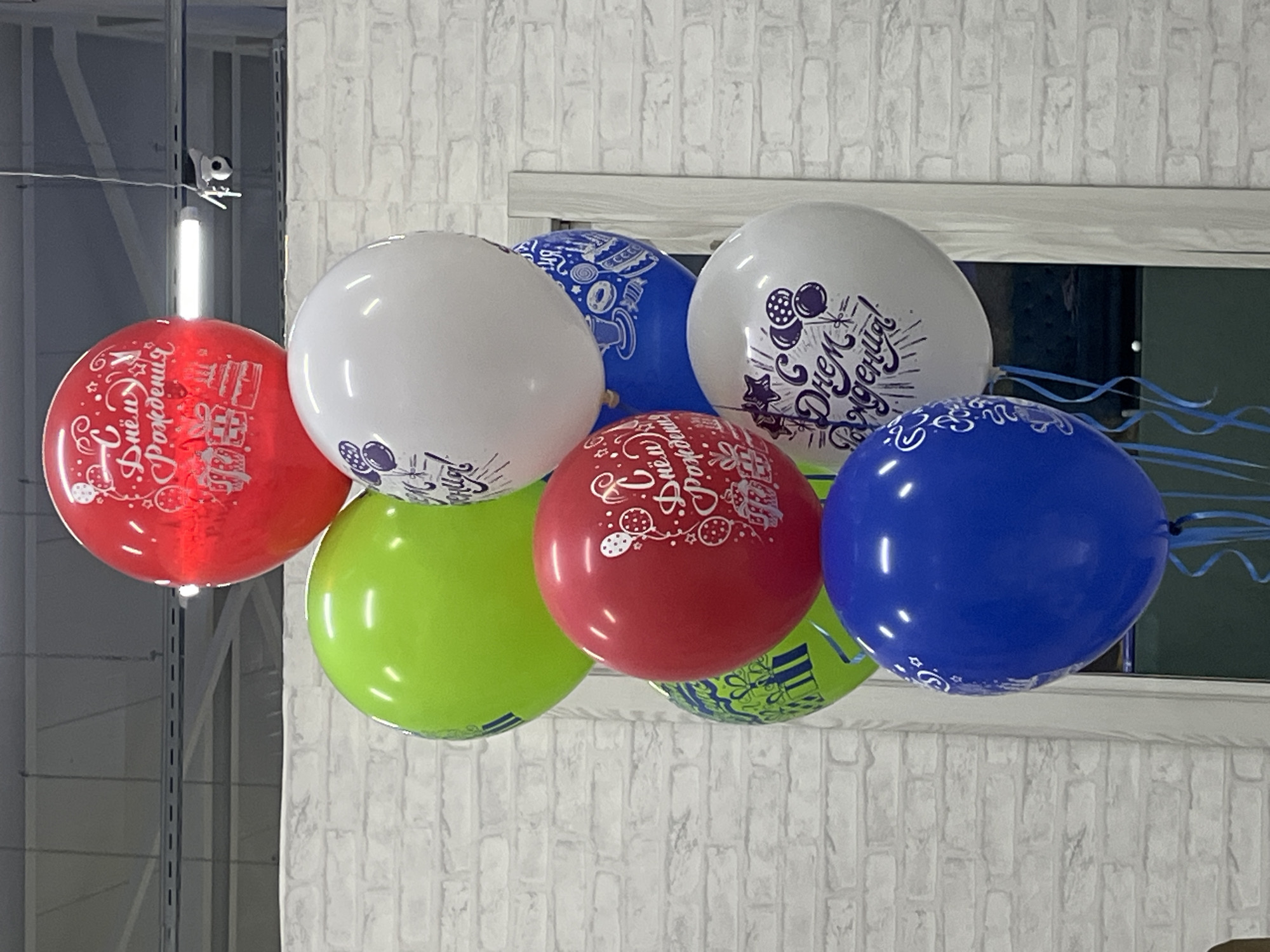 This indoor scene, located in the city of Ketoshi, Russia, features a vertical cluster of nine inflated latex balloons. The cluster consists of two red, two lime green, three white, and two blue balloons. Both red balloons and three white balloons are inscribed with the Russian phrase 'С Днём Рождения' (Happy Birthday), accompanied by white or dark-colored festive graphics such as gift boxes, cakes, and confetti. One blue balloon is patterned with white outlines of coffee cups, donuts, and cakes. Blue ribbons are visible securing the balloons at their base. The background includes a light-colored, possibly faux, brick-patterned wall. Above, an industrial-style ceiling with dark exposed beams, ducting, and white track lighting fixtures is visible. A white dome-style security camera is mounted on a ceiling beam in the upper right quadrant of the image. A light-colored vertical architectural frame, possibly a door or window frame, is partially visible on the right, bordering a dark, reflective area. No individuals are present in the image.