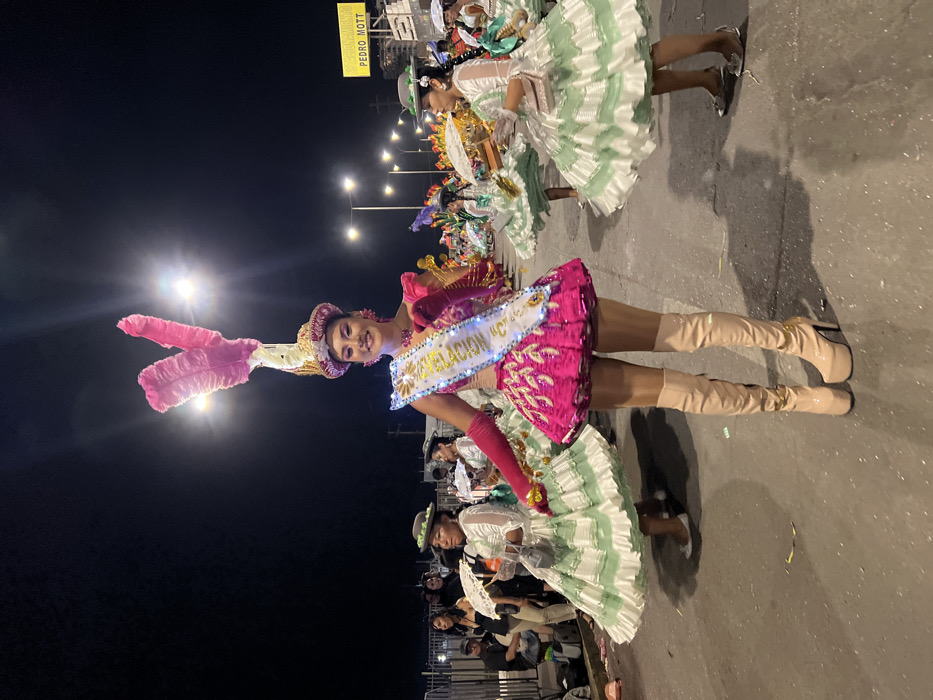 A woman in a vibrant pink dress and thigh-high boots poses at night. She wears a feathered headdress and a sash that reads "Revelacion C". The street is lined with onlookers. Behind her, other performers in white and green frilly dresses stand under streetlights. A yellow sign reads "Pedro Mott".