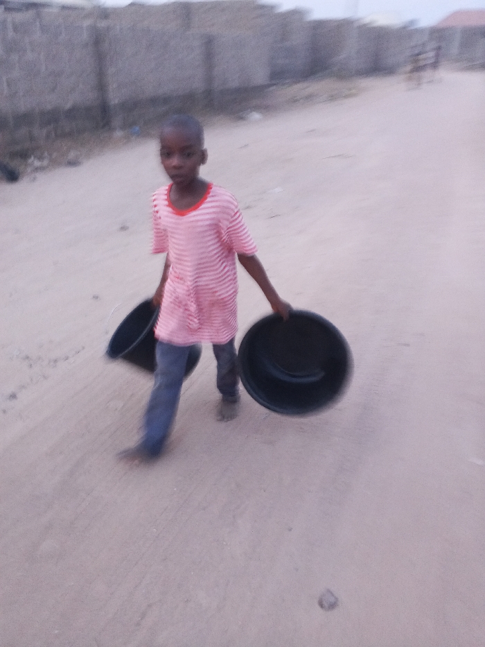 A young boy walks on a dirt road, carrying two black buckets. He wears a pink and white striped shirt and blue jeans. The road stretches into the distance, flanked by a block wall on the left and an indistinct structure on the right. The image appears somewhat blurry, suggesting movement or lower lighting conditions. A single stone is visible on the road in the foreground.