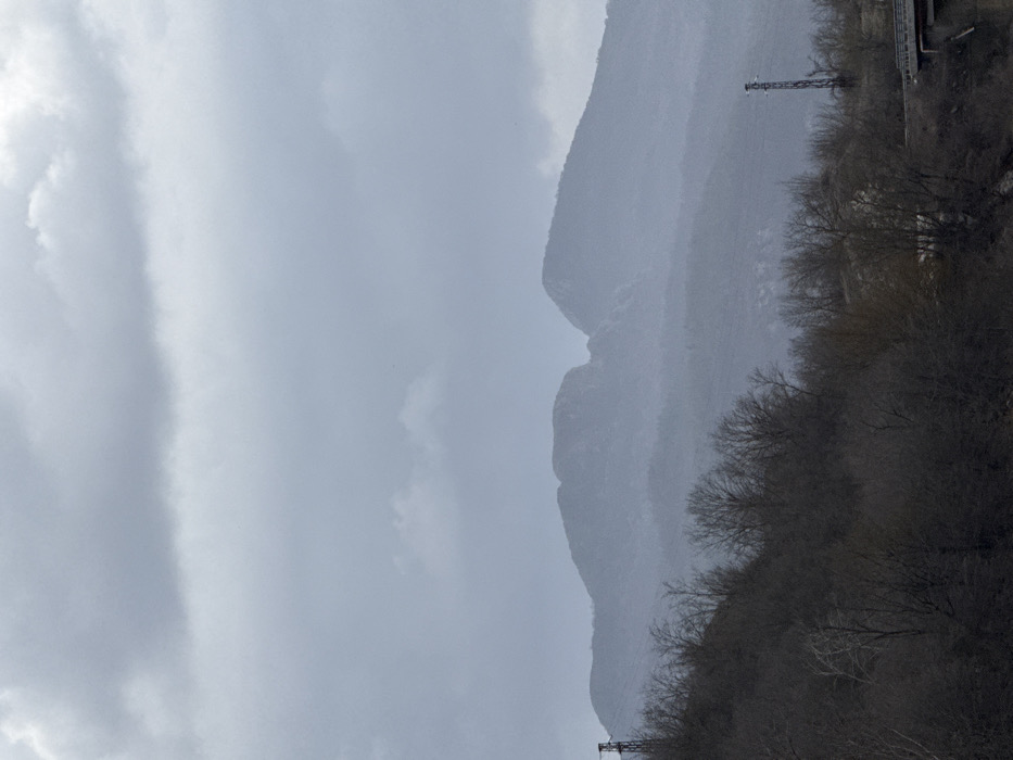 The image displays a mountainous landscape in Asparuhovo, Bulgaria, under an overcast sky filled with dense grey clouds. The foreground consists of a steep hill covered extensively with dark, bare deciduous trees, indicating a leafless season. A metal lattice pylon is visible on the upper left slope of this hill, with another similar pylon partially obscured by trees on the lower right. To the far right, a concrete bridge structure extends horizontally. In the background, multiple layers of hazy mountains are visible, dominated by two distinct, rugged peaks. No individuals, actions, or specific interactions are present in the scene.