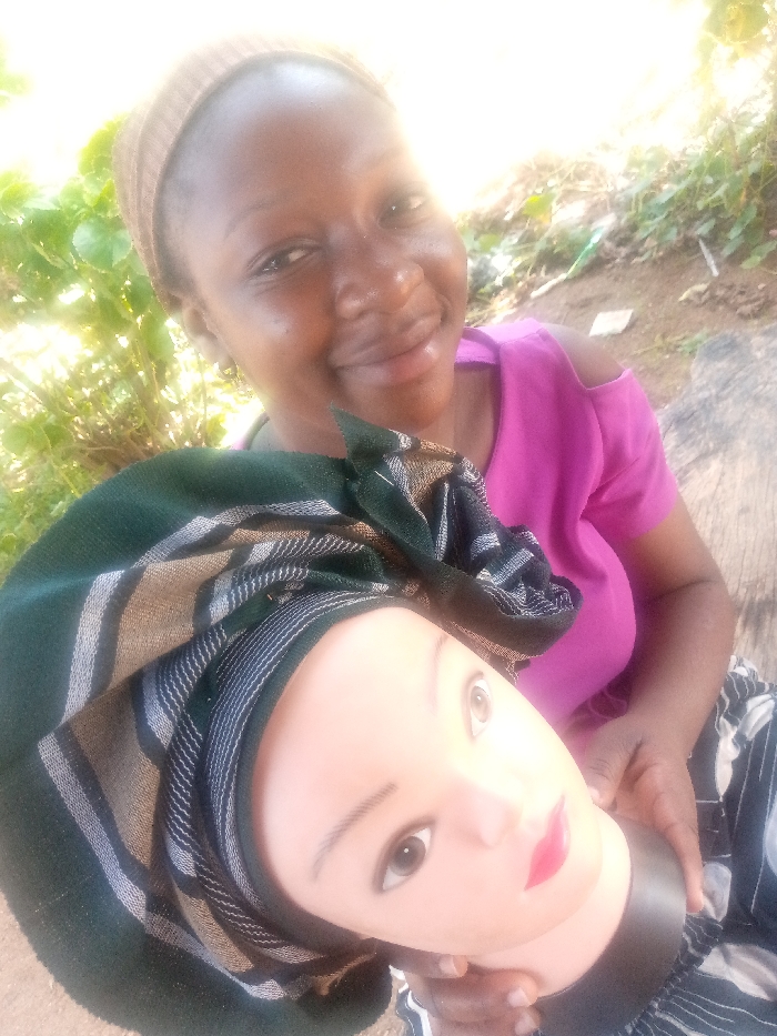 An adult female, approximately 25-35 years old with dark skin, a brown headwrap, and a magenta cold-shoulder top, is smiling directly at the camera. She is holding a light-skinned mannequin head with light-colored eyes, red lips, and a dark green headwrap featuring light brown and black stripes. The mannequin head is oriented upside down relative to the viewer and held by its black neck base. The scene takes place outdoors in an unpaved, vegetated area within the city of Unknown, Unknown, characterized by lush green foliage in the background and bright, direct sunlight.