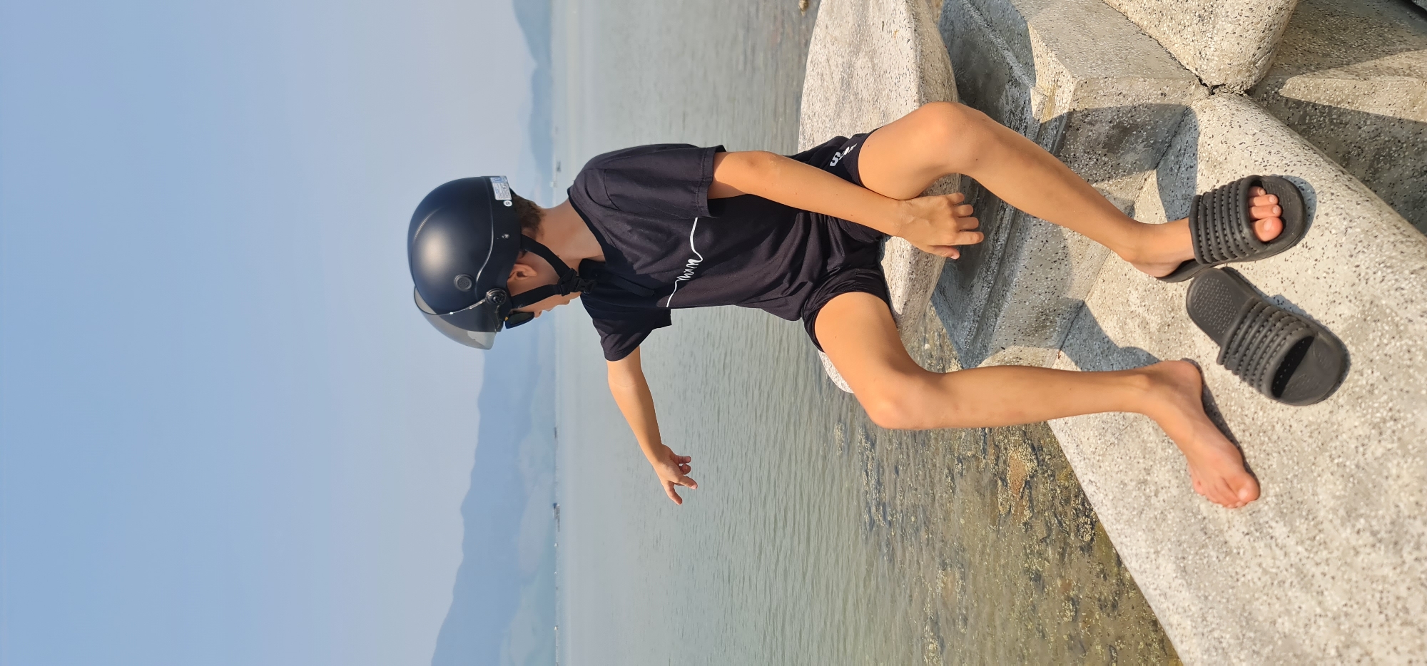 - "A person wearing a black helmet, a black t-shirt with white writing, and black shorts is sitting on concrete steps with their feet near the water" by FM-7pWFn2, licensed under CC BY 4.0